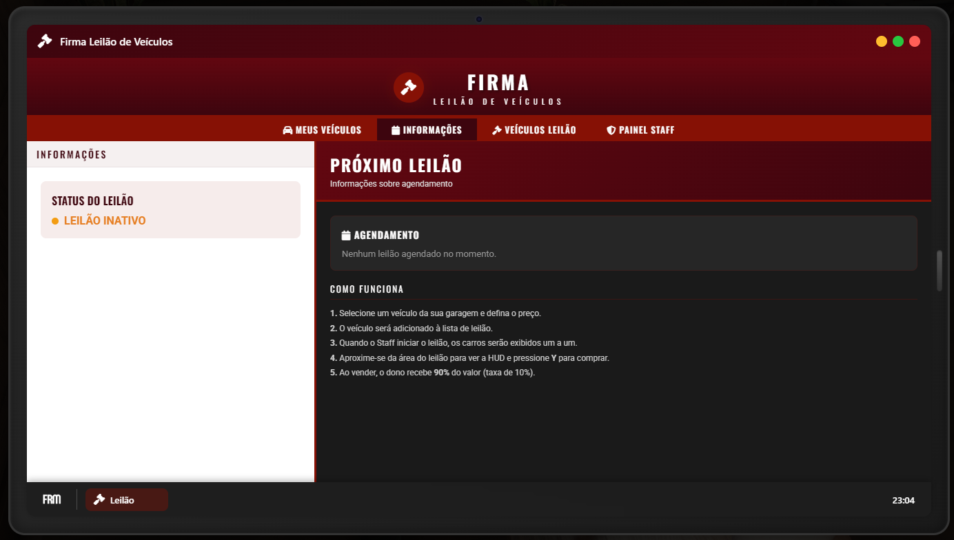 Nosso Sistema de Leilão permite que os jogadores anunciem, disputem e adquiram itens ou bens dentro do servidor de forma dinâmica e competitiva, trazendo mais emoção e movimentação para a economia do roleplay. Com este sistema, é possível criar leilões personalizados, dar lances em tempo real e acompanhar as disputas diretamente pelo menu, garantindo transparência e interação entre os jogadores. Ao final do tempo estipulado, o maior lance vence automaticamente, tornando o processo justo e automatizado para todos.